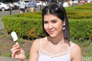 Sweet and innocent barely legal brunette acts like a real lady as she undresses by the pool and spreads her pussy apart to insert a vibrator that will make her orgasm in minutes