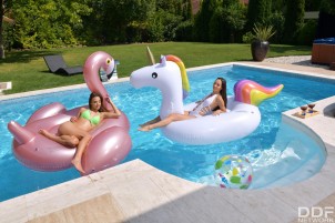 Teen girlfriends are having fun at the pool when one of them pulls out a two way dildo and they both get so horny that they slobber all over it and stuff their pussies simultaneously experiencing new sensations