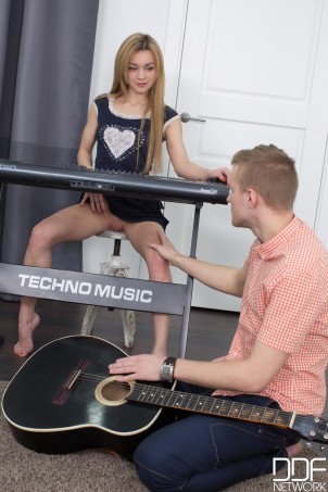 Gorgeous barely legal blonde teen babe gets seduced by her well hung music partner and she can't resist his huge cock so she puts it in her mouth to get it all hard and wet for her tight shaved pussy which gets pounded hardcore on the floor