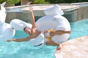 Naughty blonde MILF babes with huge natural tits Vittoria Dolce and Katy Jayne team up on one lucky cock by the pool taking turns in slobbering all over it while deepthroating and getting their asses pounded hardcore until they beg for a cumshot and swap cum