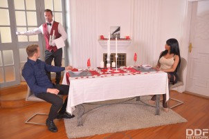 This beautiful slutty brunette MILF babe Valentina Ricci takes on her husbands cock under the table during dinner attracting the attention of their butler who gets invited to join in on the fun so he also pulls out his cock and they take turns fucking her tight asshole and cum together in her mouth