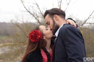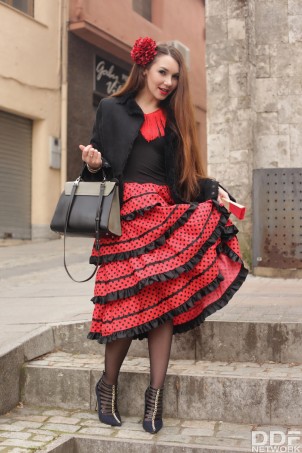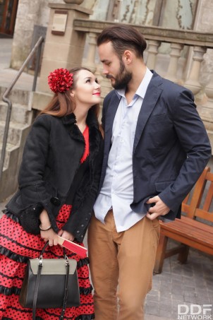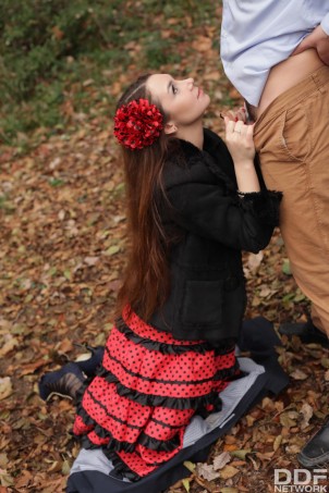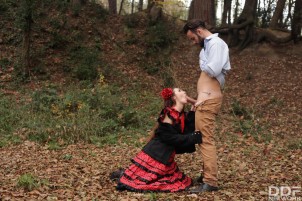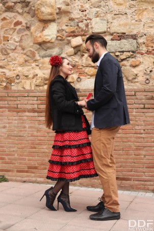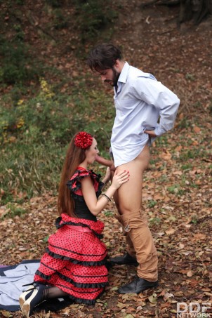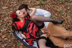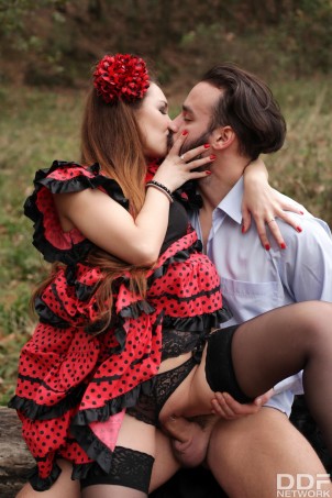 Stacy wears a flamenco uniform with a flower in her hair but she needs to fuck immediately so she takes her boyfriend to a secluded but public place to fuck him and swallow his load