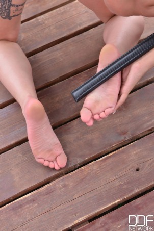 Helena Valentine works outdoors totally naked under the eye of hot smoking Coco De Mal who decides to motivate her with different sex toys and hard sex games