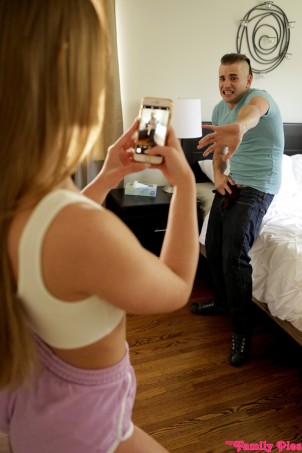 Dude jerks off when he realizes his girlfriend shoots him doing that, luckily she just wants him to place his cock into her total disposal on his comfy bed
