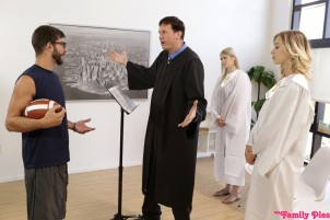 Slender shaped blonde teen church girl got her young pussy and tiny asshole excitingly licked by some perverted dude wearing glasses right behind a great father and then enjoys sucking his dick and lies down with wide spread knees and gets fondled by horny father in the church in front of girlfriend