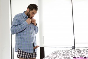 Slim dark-haired sweetie teases her man with her small tits, finally, she achieves her goal, gives man a blowjob, sits down on his cock and rides it till orgasm