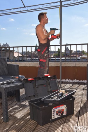 Luxurious blonde in light sexy dress is sitting armchair on the rooftop and feeling horny about young handsome worker and naughtily covets to him and pleases with tight blowjob in bent over position and then undressing and enjoying sucking big dick and fondling her juicy young medium boobs and pussy