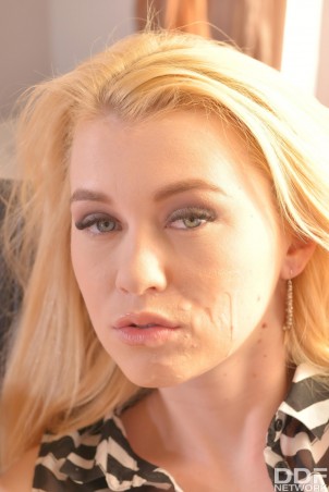 Blonde office slut Misha found a strange painting in the office with a cock coming out of the hole on it so she grabbed that stiff rod and sucked on it until she got her face splattered with warm man juice