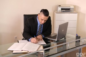 The best way to celebrate a successful business deal she made is to take her partners dicks in her mouth and pussy simultaneously to culminate the situation with a double cum shot on her face