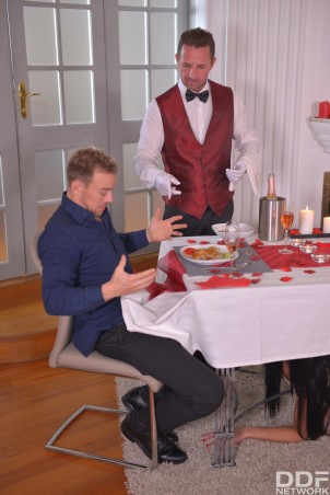 This beautiful slutty brunette MILF babe Valentina Ricci takes on her husbands cock under the table during dinner attracting the attention of their butler who gets invited to join in on the fun so he also pulls out his cock and they take turns fucking her tight asshole and cum together in her mouth