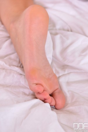 Gorgeous blonde gets her feet sucked before caressing a long dick of her excited boyfriend with her gentle soles and toes as foreplay before the main event